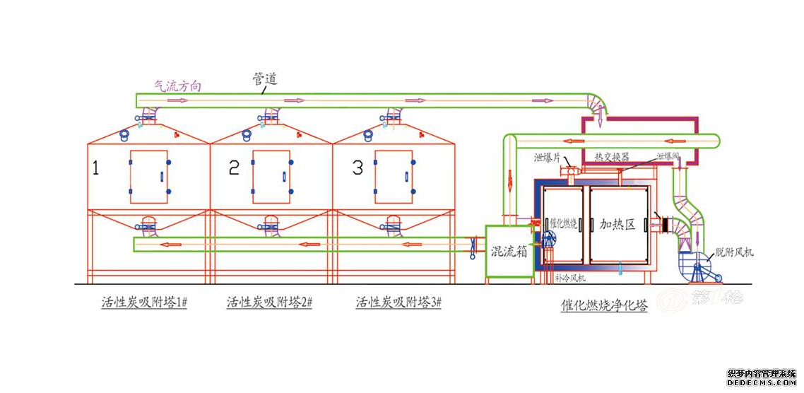 活性炭脫附再生及催化燃燒流程:當(dāng)吸附達(dá)到飽和之后,通過閥門切換進行再生。熱空氣進入吸附床,對活性炭進行加熱、活性炭受熱解析出較高濃度的有機氣體,由脫附循環(huán)風(fēng)機引入催化燃燒床,廢氣經(jīng)催化燃燒生成二氧化碳,水等無害氣體和部分的熱量,熱量回收用于活性炭的解析再生。整套吸附和催化燃燒過程由PLC實現(xiàn)自動控制。